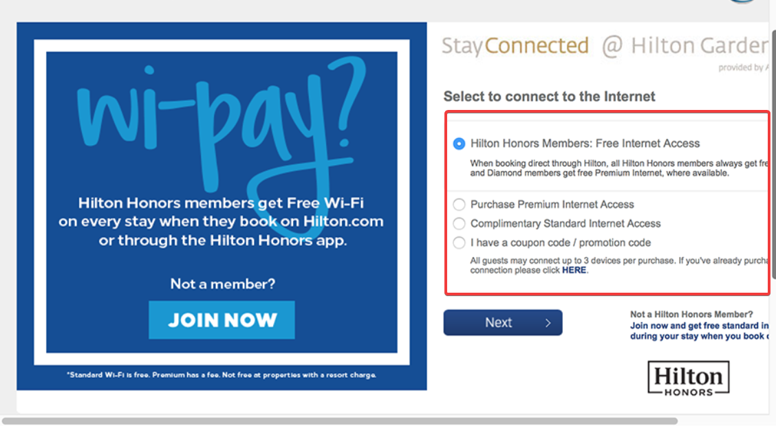 在您的設備上啟用 WiFi 並選擇希爾頓 WiFi 網絡。 打開瀏覽器觸發登錄頁面,然後輸入您的姓氏和房間號(或希爾頓榮譽客會憑據)。 選擇您的 WiFi 等級-免費基本 WiFi 或速度更快的高級 WiFi。 如果遇到問題,請清除瀏覽器緩存或嘗試輸入 URL 來加載登錄頁面。 對於多台設備,分別在每台設備上登錄並相應地管理帶寬。