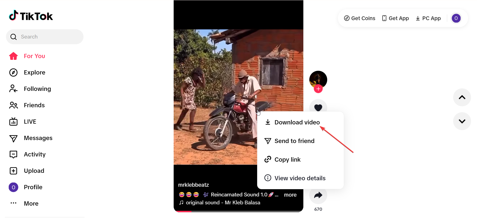 要使用此選項,請在瀏覽器中打開 tiktok.com 並登錄您的帳戶。接下來,播放要保存的視頻,右鍵單擊視頻並選擇下載視頻。最後,您將在瀏覽器的默認下載文件夾中找到 MP4 文件。