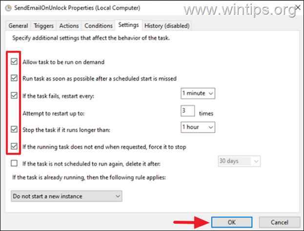 允許任務按需運行 在錯過計劃啟動後儘快運行任務。 如果任務失敗,則每 1 分鐘重新啟動一次。 如果任務運行時間超過 1 小時,請停止該任務 如果正在運行的任務未按請求結束,則強制其停止。