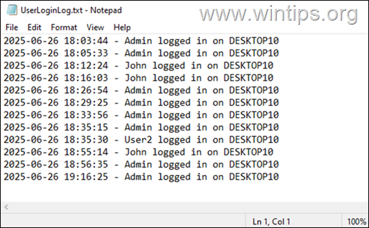 9. 登錄後,您在 PowerShell 腳本(步驟 1)中指定的收件人電子郵件地址應該會收到一封電子郵件警報,通知您哪個用戶解鎖並登錄到計算機以及何時。此外,登錄事件還將記錄在“Scripts”文件夾內的“UserLoginLog.txt“文件中(例如本例中的“C:\Windows\System32\Scripts\UserLoginLog.txt”)。 *