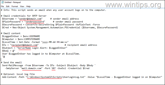 將“[email protected]”替換為您的發件人電子郵件地址。將“senderpassword”替換為發件人的電子郵件地址密碼。將“[email protected]”替換為收件人的電子郵件地址。將“ServerName”替換為您的 Windows 服務器名稱或計算機名稱。 將“mail.domain.com”替換為您的 SMTP 服務器的名稱。如果需要,將“587″替換為 SMTPS 服務器的端口。 如果您在其他位置創建了“Scripts”文件夾,請將“C:\Windows\System32\Scripts”替換為“Scripts”文件夾的完整路徑。