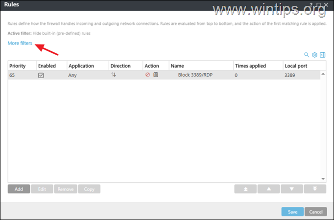 為新規則輸入名稱(例如“阻止 3389/RDP”)*,然後應用以下設置:將規則設置為:啟用 操作:阻止方向: IP 協議:TCP 本地端口: 3389 配置文件:任何