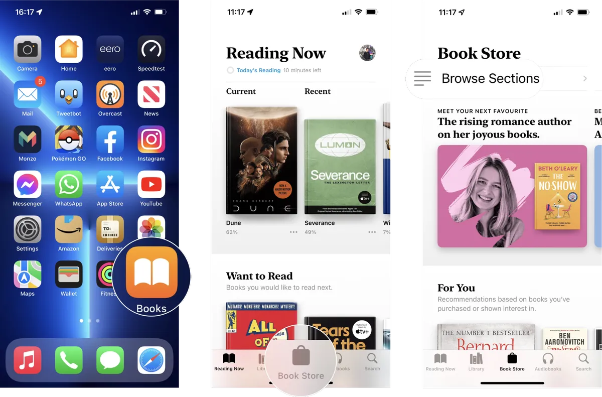 輕按主屏幕或應用程序庫中的圖書圖標。 選擇立即閱讀查看您最近打開的內容,或切換到圖書館查看您已下載的所有內容。 當您想要查找新的 Apple Books 進行下載時,請點按底部欄上的Book Store。