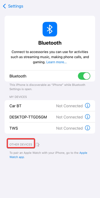 從右上角向下滑動,然後點擊藍牙圖標將其打開。接下來,轉到“設置”>“藍牙”,並在 iPhone 搜索設備時保持頁面打開。