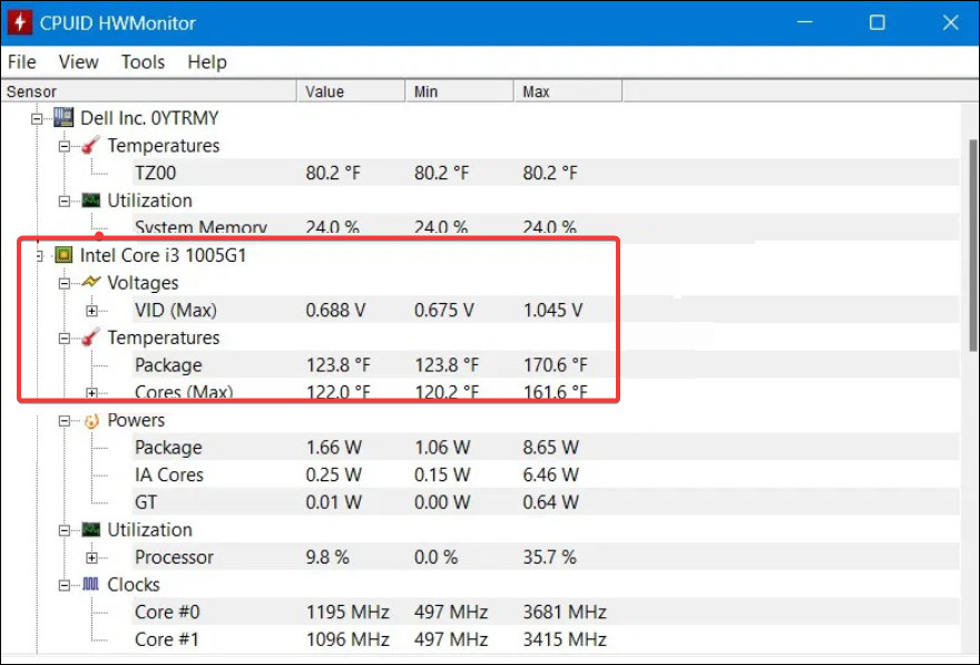 像任何其他 Windows 桌面實用程序一樣安裝 HWMonitor 並啟動該應用程序。接下來,滾動到左側面板中的 CPU 型號並展開“溫度”部分。從此處讀取當前值、最小值和最大值。