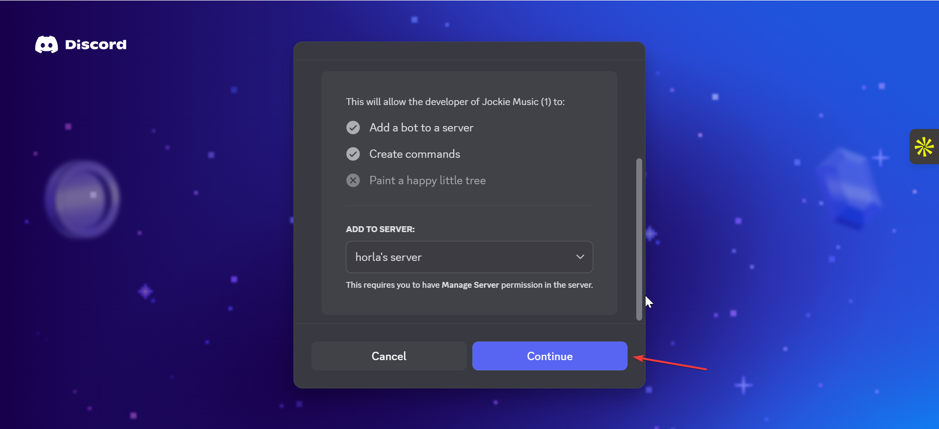 在移動瀏覽器中打開機器人的邀請鏈接,然後選擇您擁有管理服務器權限的服務器。接下來,點擊“繼續”並批准請求的權限。