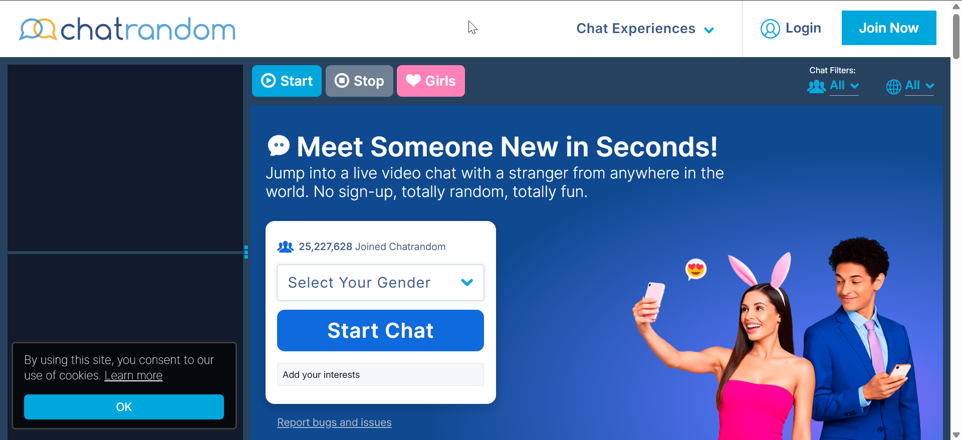 ChatRandom 通過群聊、主題房間和國家過濾器等模式擴展了隨機聊天概念。這些選項為您提供了更多結識新朋友的方式。該界面加載速度快,並支持視頻和文本。