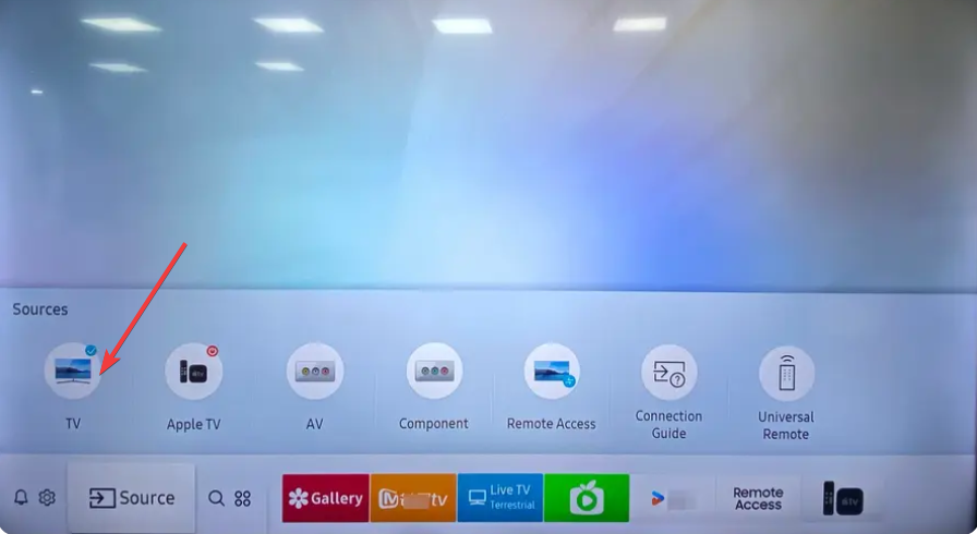 按主頁在遙控器上,選擇來源,然後選擇電視或空氣。這會告訴您的 QLED 讀取無線輸入,而不是 HDMI 或流媒體應用程序。