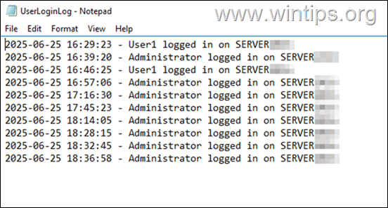 6. 重新登錄服務器,幾秒鐘後,您將收到有關此登錄事件的電子郵件通知。登錄事件還將記錄在“Scripts”文件夾內的“UserLoginLog.txt“文件中(例如本例中的“C:\Windows\System32\Scripts\UserLoginLog.txt”)。 *