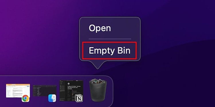 然後,將鼠標懸停在停靠欄上,右鍵單擊回收站,然後清空垃圾箱。