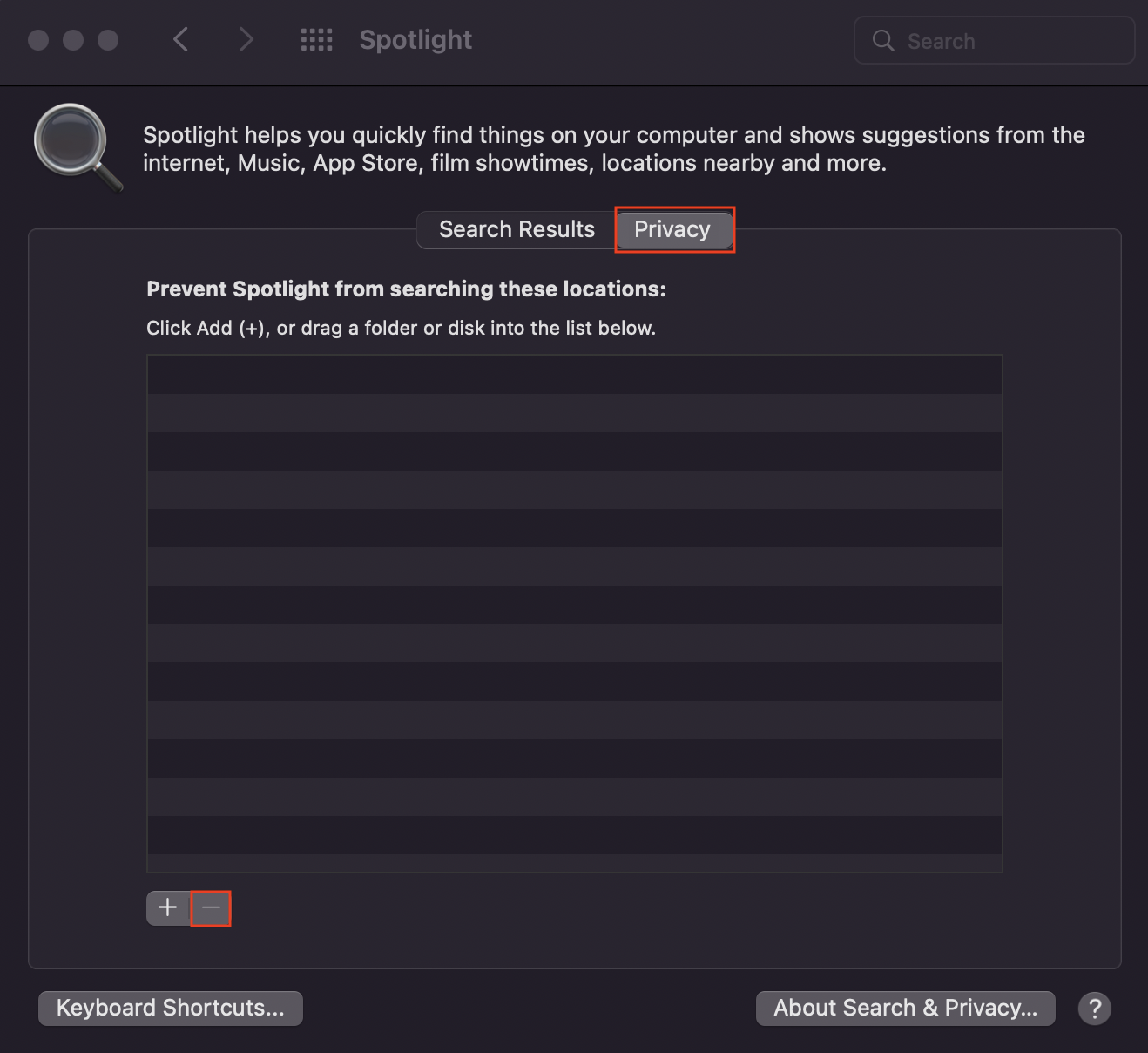 選擇 Spotlight。轉到隱私部分。在這裡,單擊‘+’符號將新文件夾添加到限制列表。當您將文件夾添加到此列表時,Spotlight 無法訪問它。