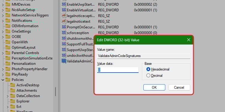 大多數時候,您不想調整您的註冊表文件,除非您知道自己在做什麼並且沒有其他方法可以解決問題.但是,您可以進行快速調整,這可能會產生很大的不同。關閉 ValidateAdminSignatures 選項以查看它是否消除了此錯誤代碼。