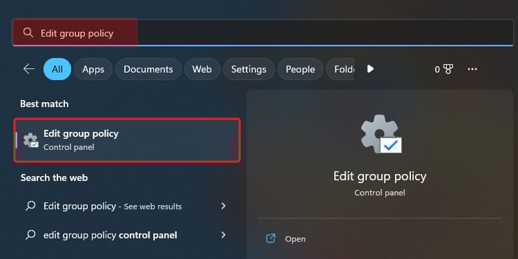 按 Windows 鍵並在搜索欄中鍵入編輯組策略。點擊相應的程序。