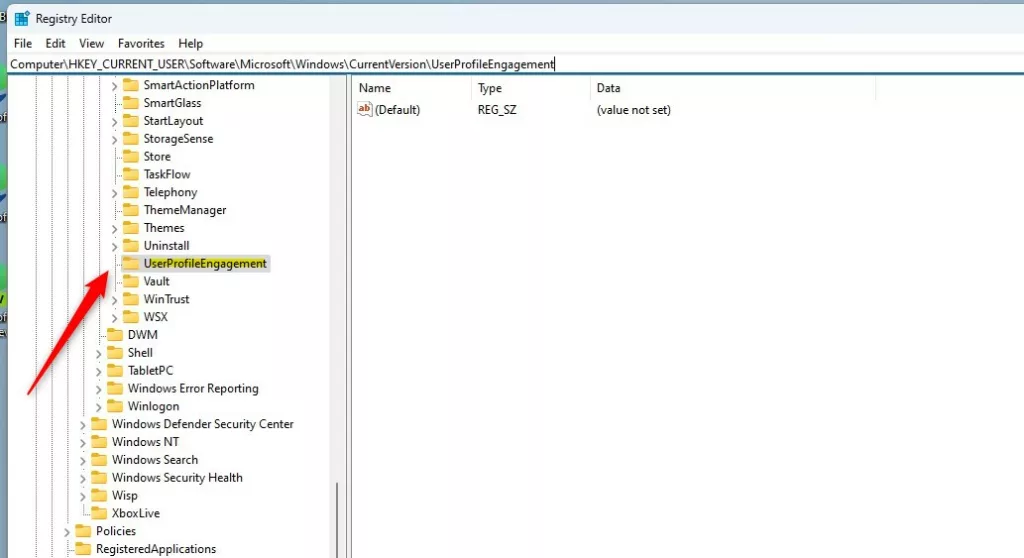 如果您沒有看到 UserProfileEngagement 文件夾鍵,右鍵單擊 CurrentVersion 父鍵,然後創建子鍵 (UserProfileEngagement) 文件夾。