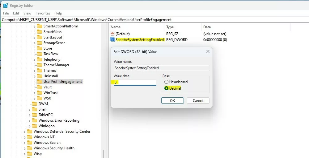 雙擊新值名稱 (ScoobeSystemSettingEnabled) 並輸入值數據 0 以在登錄時禁用顯示窗口。