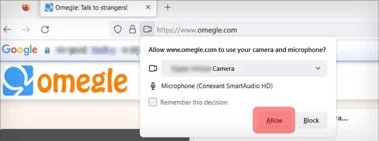 點擊允許。如果您希望Omegle 始終能夠訪問您的相機,請啟用記住此決定選項。