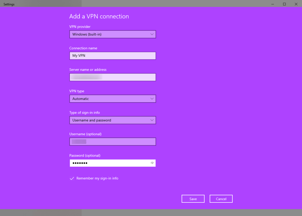 VPN 提供商: Windows (內置)連接名稱:您選擇的名稱。這是您將在網絡連接彈出窗口中看到的名稱。服務器名稱或地址:輸入 VPN 服務器的 IP 地址或域名。VPN 類型:選擇自動。登錄信息類型:選擇您的 VPN 服務提供商使用的身份驗證方法。在我的例子中,它是常規的用戶名和密碼。用戶名和密碼:輸入身份驗證詳細信息。如果您不選擇“記住我的登錄信息“複選框不想每次都輸入登錄詳細信息。