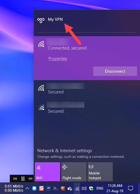 由於 VPN 連接已保存,您可以從 Windows 10 中的“網絡連接”彈出菜單和 Windows 中的“快速設置”面板訪問它11.