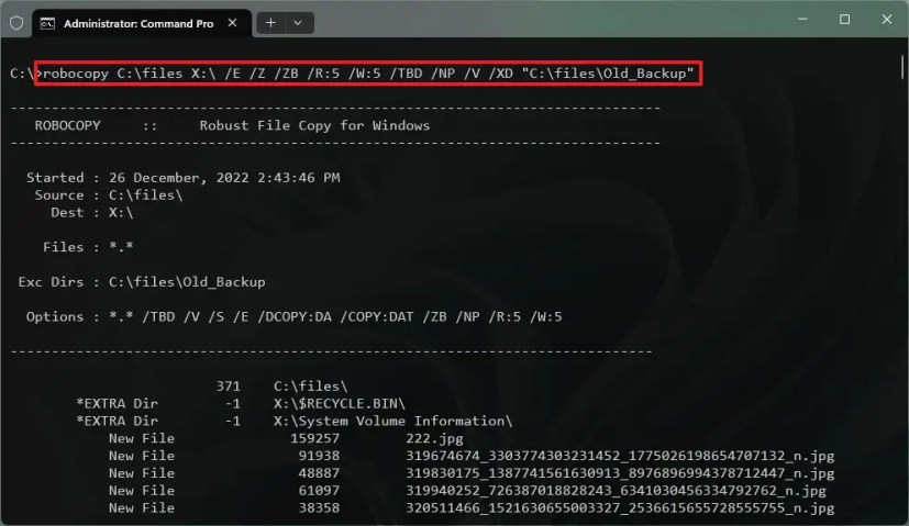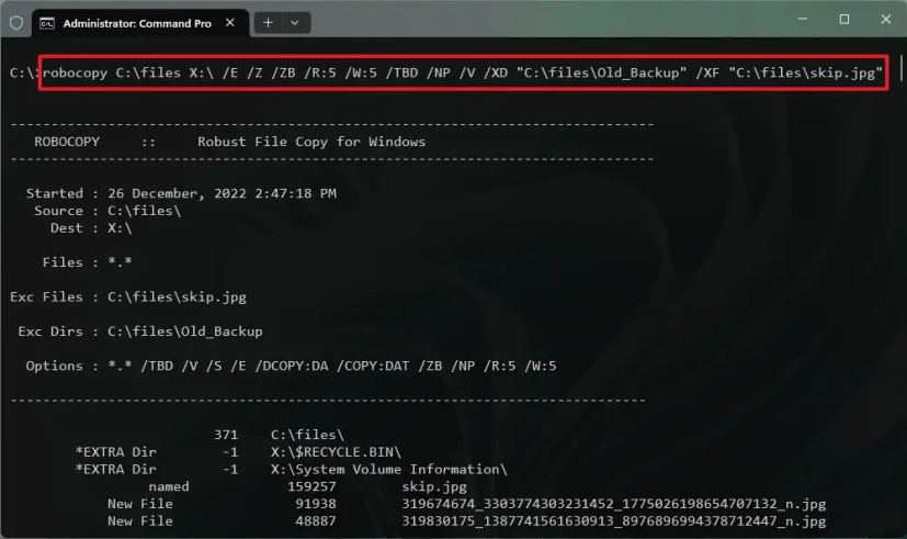 完成這些步驟後,所有內容都將復製到新位置,但您在命令中使用 /XD 和 排除的那些文件和文件夾除外/XF 開關。