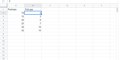 Nehmen wir an, wir müssen Daten für einen Personal Trainer untersuchen. Der Personal Trainer hat uns die Nummern seiner Kunden bezüglich ihres Liegestütz-und Klimmzugfortschritts zur Verfügung gestellt, und wir haben sie in Google Spreadsheet eingegeben.