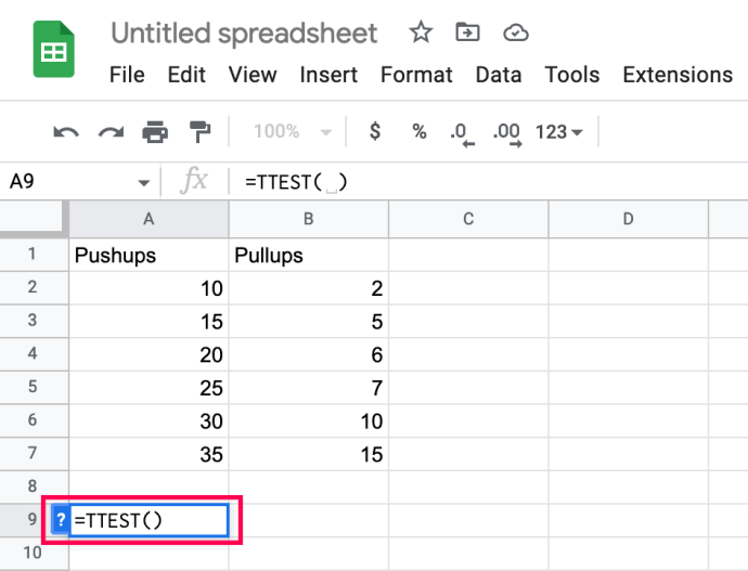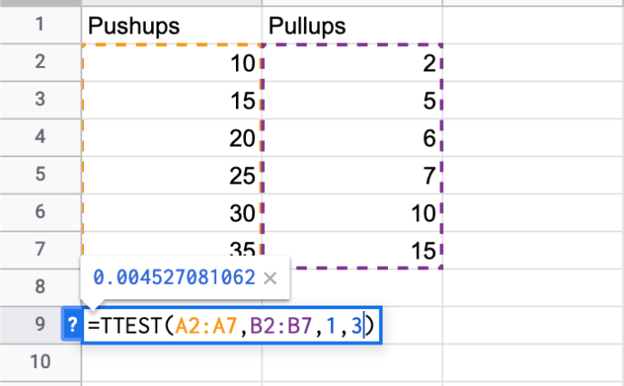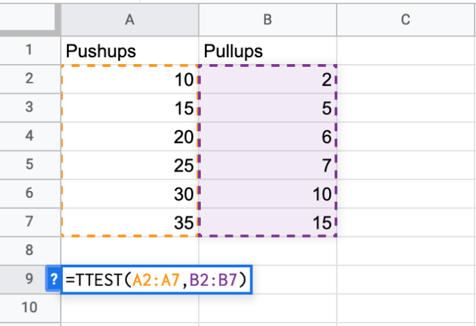 Nennen Sie eine Spalte unserer Wahl TTEST und zeigen Sie die Ergebnisse dieser Funktion in der Spalte daneben an. Klicken Sie auf die leere Spalte, in der die p-Werte angezeigt werden sollen, und geben Sie die benötigte Formel ein. Geben Sie die folgende Formel ein:=TTEST(A2:A7,B2:B7,1,3). Wie Sie sehen können, bezeichnet A2:A7 den Anfangs-und Endpunkt unserer ersten Spalte. Sie können Ihren Cursor einfach an der ersten Position (A2) halten und an das Ende Ihrer Spalte ziehen, und Google Spreadsheets aktualisiert Ihre Formel automatisch.