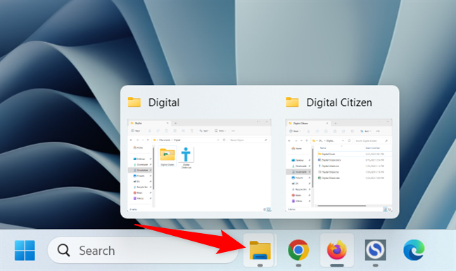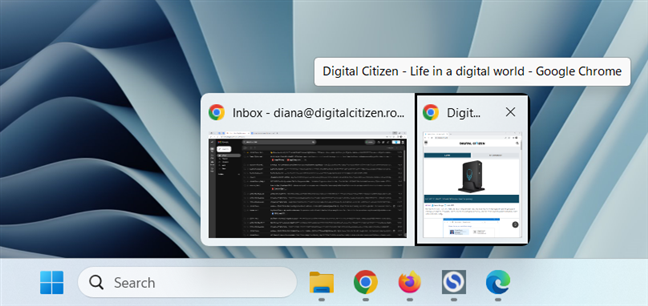 Wenn Sie mehrere Fenster derselben App öffnen, bewegen Sie den Mauszeiger darüber oder durch Klicken/Tippen auf das entsprechende Symbol wird eine Vorschau aller geöffneten Fenster angezeigt. Klicken oder tippen Sie auf eine der Vorschauen, um das Fenster wiederherzustellen oder in den Fokus zu rücken.
