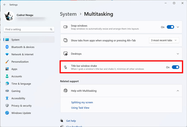 In Windows 11 haben Sie auch die Option um alle Fenster außer dem aktiven mit der Maus oder dem Finger zu minimieren. Fassen Sie einfach die Titelleiste des App-Fensters an, das Sie behalten möchten, und schütteln Sie es, bis die anderen Fenster minimiert sind. Schütteln Sie es erneut, um die minimierten Fenster wiederherzustellen. Denken Sie jedoch daran dass diese Aktion zuerst aktiviert werden muss, indem Sie auf Einstellungen > System > Multitasking zugreifen und den Schalter „Fenster in der Titelleiste schütteln“ aktivieren.