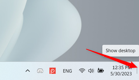 Die Schaltfläche „Desktop anzeigen“ in der Taskleiste minimiert alle App-Fenster auf Ihrem Bildschirm mit einem Klick oder Tippen. Es sieht aus wie ein dünner vertikaler Streifen und Sie finden ihn in der unteren rechten Ecke Ihres Hauptbildschirms (auf sekundären Monitoren nicht verfügbar) neben der Taskleistenuhr. Klicken oder tippen Sie darauf, um alle geöffneten Fenster auf Ihrem PC zu minimieren und Ihren Desktop anzuzeigen.