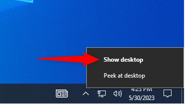 TIPP: Alternativ können Sie in Windows 10 auch mit der rechten Maustaste klicken oder + drücken-Halten Sie die Schaltfläche „Desktop anzeigen“ gedrückt, um ein Menü anzuzeigen, in dem Sie auf die Option „Desktop anzeigen“ klicken oder darauf tippen können.