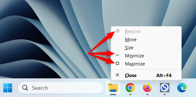 Sie können dasselbe Menü auch aufrufen, indem Sie Umschalttaste + Rechtsklick drücken ( oder Umschalttaste + gedrückt halten für Touchscreens) auf dem Taskleistensymbol einer geöffneten App. Anschließend können Sie auf „Minimieren“, „Maximieren“ oder „Wiederherstellen“ klicken oder tippen oder die entsprechenden Tasten N, X und R verwenden.
