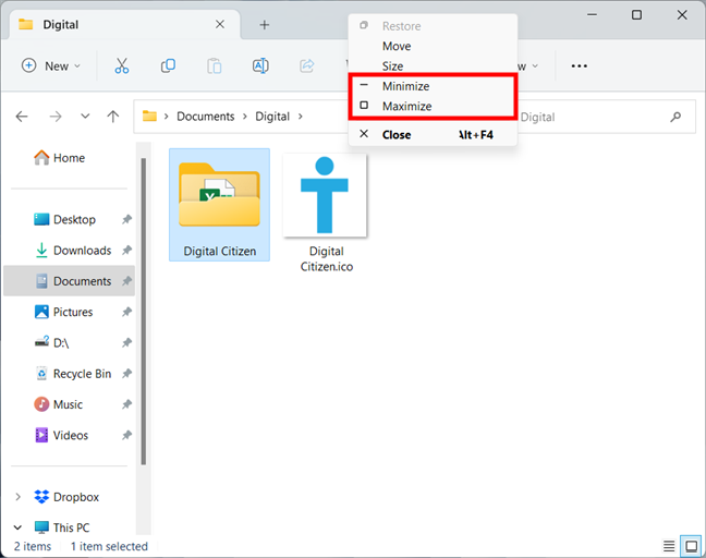 Sie können das Titelleistenmenü auch verwenden, um Apps in Windows 10 und Windows 11 zu minimieren und zu maximieren. Wenn Sie die Maus oder die Verwendung Ihres Touchscreens bevorzugen, richtig-Klicken Sie auf die Titelleiste eines Fensters oder halten Sie sie gedrückt, um das Menü zu öffnen. Klicken oder tippen Sie dann auf die Option „Minimieren“ oder „Maximieren“, je nachdem, was Sie tun möchten.