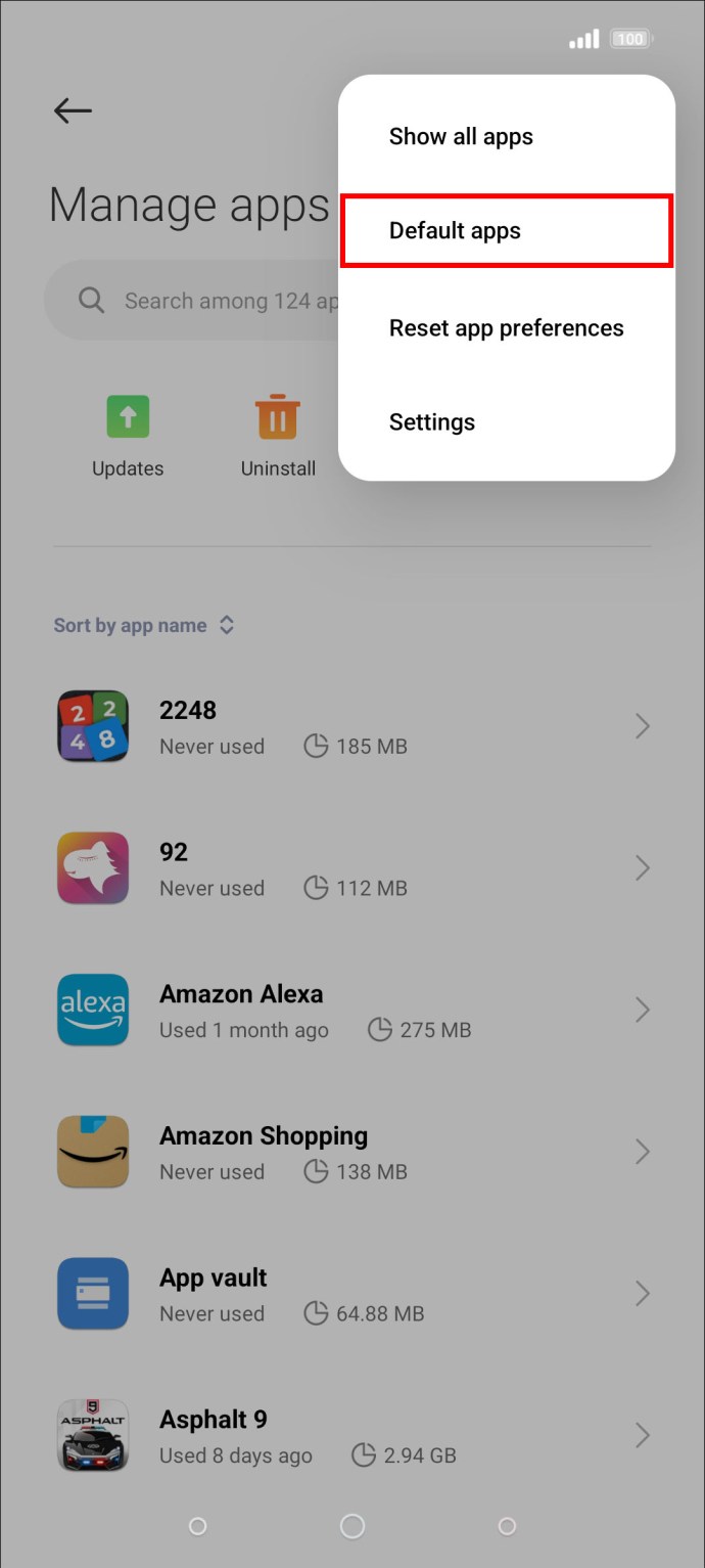 Tippen Sie auf die drei vertikalen Punkte und wählen Sie „Standard-Apps“.