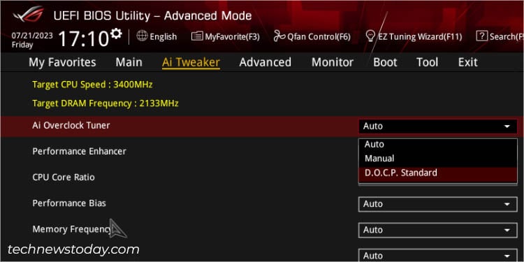 Wechseln Sie zunächst zur Registerkarte Ai Tweaker. Standardmäßig sollte der Ai Overclock Tuner auf „Auto“ eingestellt sein. Erweitern Sie das Dropdown-Menü und wählen Sie D.O.C.P. Standard.