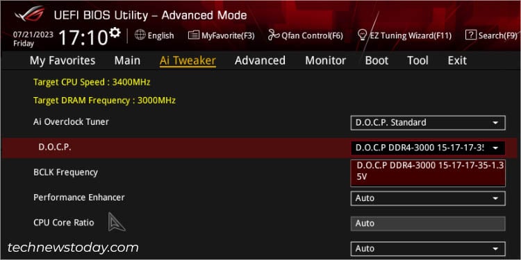 Sobald Sie dies tun, werden Sie feststellen, dass die Ziel-DRAM-Frequenz entsprechend dem eingestellten Profil ansteigt. Sie können sogar den Basistakt der CPU erhöhen, da dadurch Ihr RAM automatisch übertaktet wird. Es ist jedoch wichtig, die richtige Balance zu finden-enabling-asus-docp.jpg”height=”375″width=”750″>