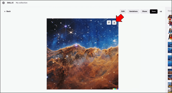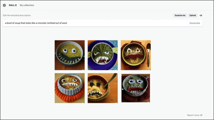 Homepage-Verknüpfung – Wenn Sie wichtige Funktionen wie die Bildbearbeitung ausführen, möchten Sie vielleicht schnell zu Ihrer Homepage zurückkehren. Klicken Sie in diesem Fall auf die DALLE-Schaltfläche oder das Symbol daneben. Es sollte sich oben links auf Ihrem Bildschirm befinden. Meine Sammlung – Dieses Menü befindet sich ebenfalls oben links auf Ihrem Bildschirm. Es enthält zuvor erstellte Grafiken und Variationen. Überrasche mich – Diese Funktion generiert zufällige Eingabeaufforderungen. Es ist eine hervorragende Möglichkeit, weiter mit DALLE zu experimentieren, wenn Sie keine Ideen mehr haben. Es kostet keine Credits, wenn Sie nicht auf die Schaltfläche „Generieren“ klicken. Andernfalls können Sie die Schaltfläche so oft drücken, wie Sie möchten, und neue Eingabeaufforderungen erhalten. Generieren – Das Hauptwerkzeug von DALLE ist „Generieren“. Klicken Sie darauf, und es werden neue Bilder basierend auf dem eingegebenen Text erstellt. Bilder zur Bearbeitung hochladen – Wenn Sie auf diesen Befehl unter dem Menü klicken, in das Sie Ihre Eingabeaufforderung eingegeben haben, wird ein Popup-Menü geöffnet. Es ermöglicht Ihnen, aus zahlreichen Quellen zum Hochladen Ihrer Dateien auszuwählen. Beispielbilder – Sie sollten keine Schwierigkeiten haben, diese Funktion auf Ihrer Hauptseite zu finden. Es gibt Ihnen Bildbeispiele, die auf DALLE 2 erstellt wurden. Bewegen Sie den Mauszeiger über ein Bild, und Sie sehen den Text, der zum Generieren der Datei verwendet wurde. Registerkarte „Profil“ – Dieses Fenster enthält Ihre Informationen, ermöglicht Ihnen den Zugriff auf verschiedene Funktionen und ermöglicht Ihnen den Kauf von Credits. Sie finden es im oberen rechten Teil Ihres Bildschirms. Neu und zuletzt – Der Bereich unter Ihrem Profil-Tab beherbergt ein Verlaufssymbol. Es enthält aktuelle Bilder und ihre Miniaturansichten. Wenn Sie auf die Schaltfläche „Neu“ klicken, löscht die Seite alle Bilder und startet eine neue Sitzung.