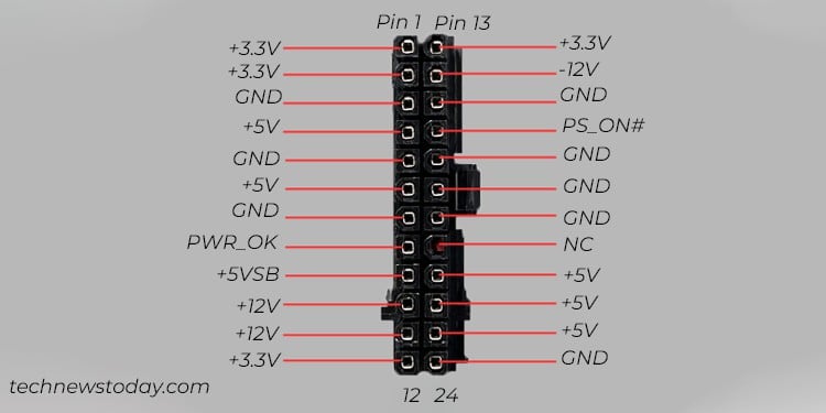 Wie im Bild oben zu sehen ist, jeder der Spannungspins im 24-Pin-ATX Der Stromanschluss sollte die vorgesehenen Spannungspegel mit einer Toleranzgrenze von ±5 % erhalten. Wenn ein großer Unterschied zwischen dem erwarteten und dem tatsächlichen Spannungsniveau besteht, können Sie bestätigen, dass Ihr Netzteil Fehler aufweist.