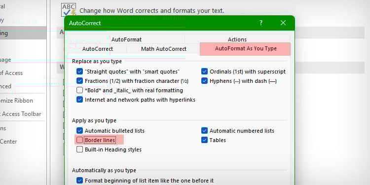 Wenn Sie nicht möchten, dass Randlinien automatisch erscheinen, wenn Sie normal tippen, haben Sie auch die Möglichkeit, sie zu deaktivieren. Befolgen Sie diese Schritte, um automatische Rahmenlinien in Word zu deaktivieren: