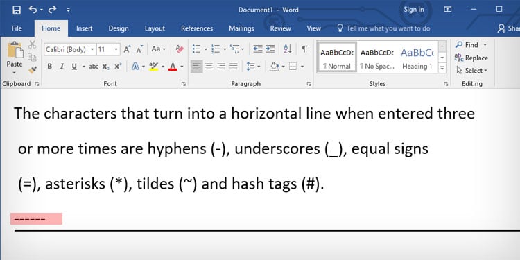Wenn Sie drei oder mehr Bindestriche, Unterstriche oder Gleichheitszeichen drücken und die Eingabetaste drücken, wird eine lange horizontale Linie in Ihr Word-Dokument eingefügt. Die meisten Benutzer verwenden diese horizontale Linie als Kopfzeile oder Trennlinie zum einfachen Lesen und Gestalten im Dokument.