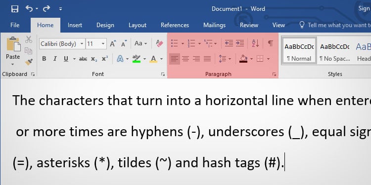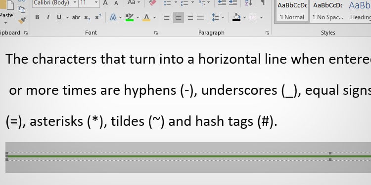 Wie wir bereits in diesem Artikel erwähnt haben, erscheinen die horizontalen Linien, wenn Sie mehrere Zeichen dreimal oder öfter hintereinander eingeben und dann die Eingabetaste drücken. Die Zeichen, die sich bei dreimaliger oder mehrmaliger Eingabe in eine horizontale Linie verwandeln, sind Bindestriche (-), Unterstriche (_), Gleichheitszeichen (=), Sternchen (*), Tilden (~) und Hashtags (#).