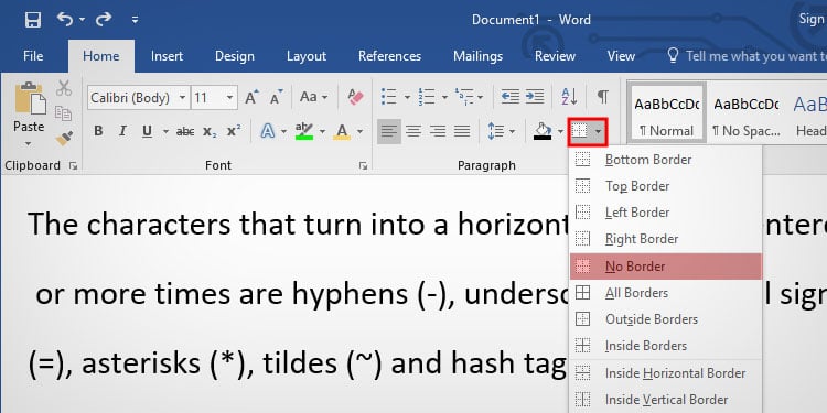 Obwohl all dies Zeichen in Ihrem Dokument eine horizontale Linie eingeben, werden sie alle unterschiedlich angezeigt. Striche geben Ihnen eine einzelne horizontale Linie, während Unterstriche sie etwas fetter machen. Da wir bereits Möglichkeiten zum Entfernen der horizontalen Linien angegeben haben, können Sie diese Zeichen in Word für ein besser aussehendes Dokument ausprobieren.