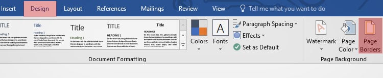 Gehen Sie im oberen Menüband zur Registerkarte Design. Klicken Sie auf Seiten Grenzen.