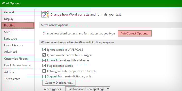 Klicken Sie auf KorrekturKlicken Sie auf AutoKorrektur-Optionen
