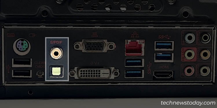 Einige verfügen möglicherweise sogar über Koaxialanschlüsse, wie der im obigen Schnappschuss (wobei sowohl koaxial als auch optisch > vorhanden sind). Suchen Sie nach S/PDIF-OUT, TOSLINK, S/PDIF, OPTICAL und ähnlichen Anzeichen, um diesen Audioanschluss zu identifizieren.