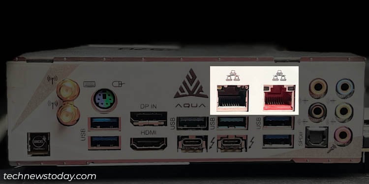 Normalerweise verfügt jedes Motherboard über einen Ethernet-Anschluss. Manche verfügen jedoch sogar über mehrere Geräte mit unterschiedlichen Bandbreiten. Während diese Ports keine Standardfarben verwenden, ist mir aufgefallen, dass Boards mit mehreren Ports Rot für höhere Bandbreiten und Schwarz für die Standardfarben verwenden.