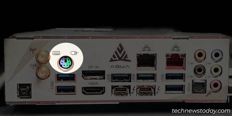 Obwohl USB die PS/2-Anschlüsse für den Anschluss von Peripheriegeräten schon vor langer Zeit abgelöst hat, sind sie immer noch auf den meisten Motherboards zu finden (sogar auf den modernen). Wie Sie im Bild oben sehen können, verfügt sogar das ASRock AQUA Sie werden wahrscheinlich individuelle PS/2-Anschlüsse für Ihre Tastatur (lila) und Ihre Maus (grün) finden.
