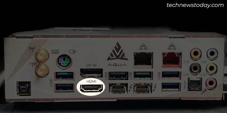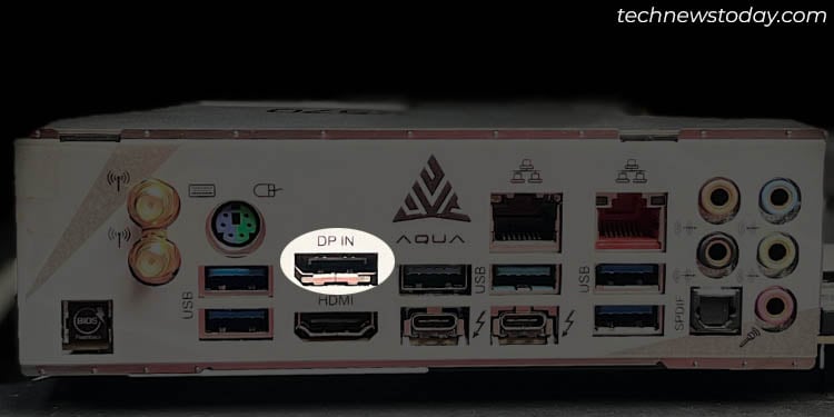 Der Anschluss ist normalerweise mit einem DisplayPort-Logo (ähnlich D) versehen oder einfach beschriftet’DisplayPort,’DP-OUT’usw. Sie sollten es also nicht schwer haben, es auf der Rückseite Ihres Motherboards zu finden.