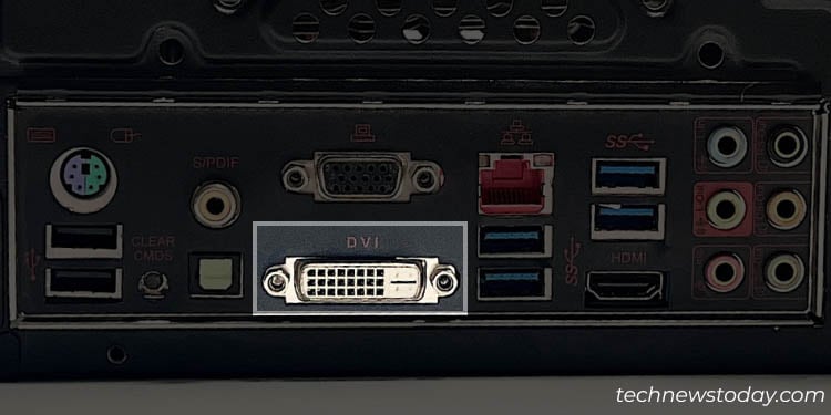 Einige ältere Motherboard-Modelle integrieren sie möglicherweise noch in die I/O-Abschirmung. Suchen Sie neben den Anschlüssen nach DVI-I, DVI-D oder DVI-A. Diejenigen mit dem Suffix „I“ kombinieren sowohl analog als auch digital, „A“ unterstützt nur analoge und „D“ steht für digitale Signale.