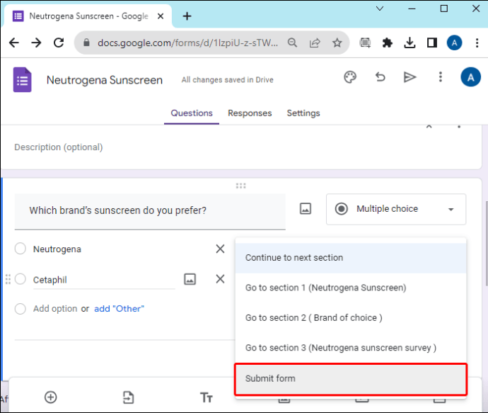 Tippen Sie für die Auswahl „Neutrogena“ auf das Dropdown-Menü rechts und wählen Sie „Gehe zu Abschnitt 3 (Neutrogena-Sonnenschutzumfrage“) ).