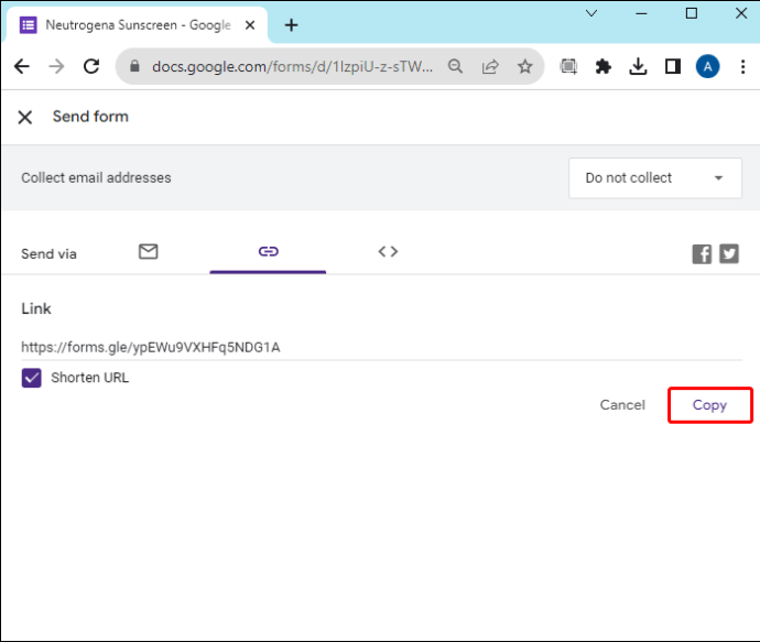 Um Ihr Formular als Link zu teilen , tippen Sie auf das „Link“-Symbol. Aktivieren Sie das Kontrollkästchen „URL kürzen“ und klicken Sie auf „Kopieren“.