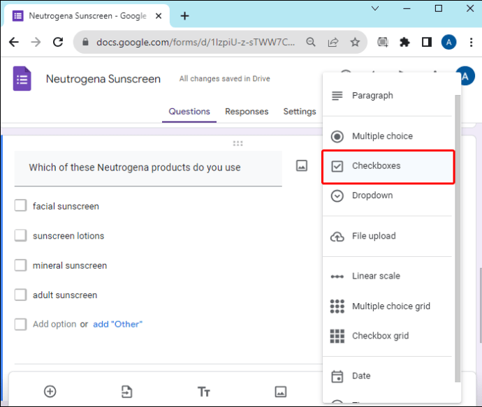 Gehen Sie rechts neben dem Formular und tippen Sie auf das Symbol „Hinzufügen“. Symbolleiste, um eine neue Frage hinzuzufügen. Geben Sie die zweite Frage ein: „Welche Sonnenschutzmarke bevorzugen Sie?“ Geben Sie die Auswahl „Neutrogena und Cetaphil“ ein.